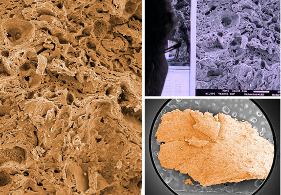 The material has a solid yet porous structure. You can water a plant less frequently since water is slowly diffused through it and stored by the cells, giving the plant time to drink.
