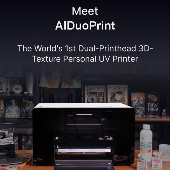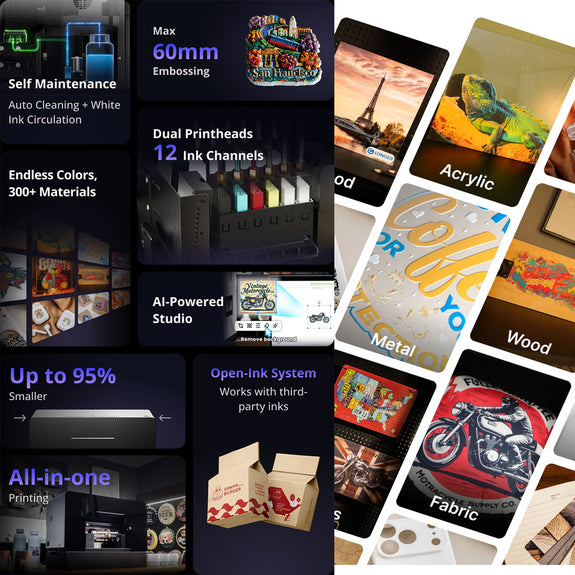Dual-Printhead | 60mm 3D Texture | 6x Faster | Open Ink System | 300+ Materials | AI-Powered | Compact | All-in-One | Auto-Cleaning