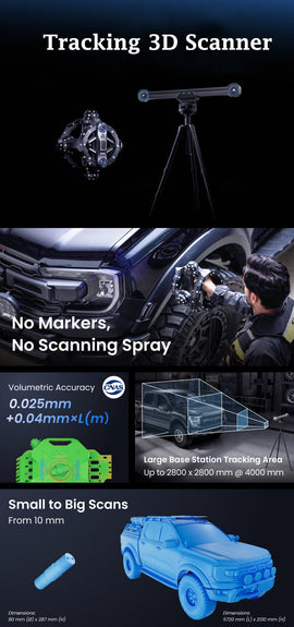 Marker-free Scans | Capture Small to Big Objects | CNAS Certified Industrial-level Accuracy | Auto Calibration | Blue Multi-Line Lasers